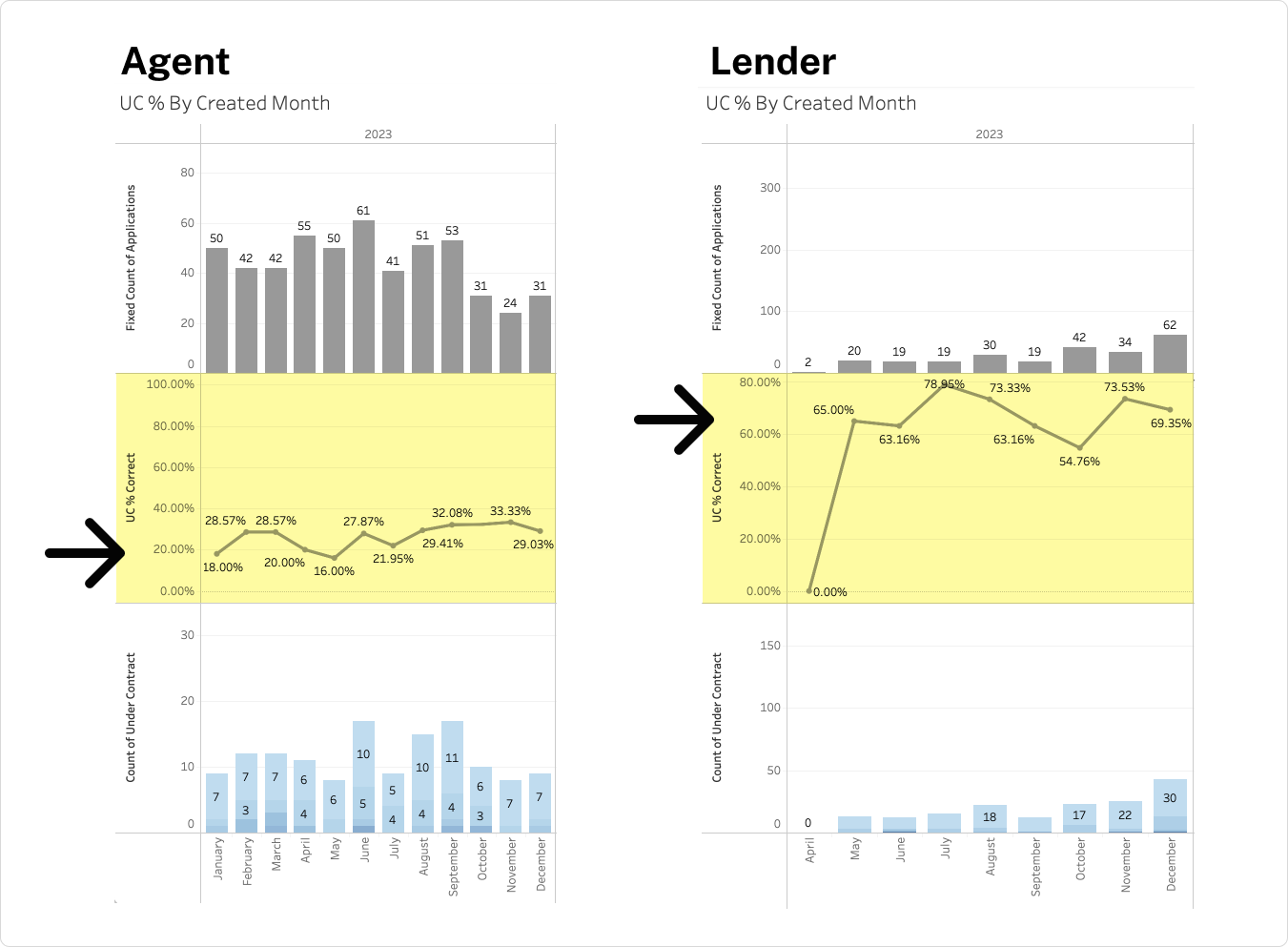 Despite having no sales outreach or marketing support behind the lender channel during the pilot, lender-led applications moved to the Under Contract stage 2.5× more often than agent-led ones (67% vs. 26%). Lender lead application volume also tripled during the same period, showing consistent, scalable performance.